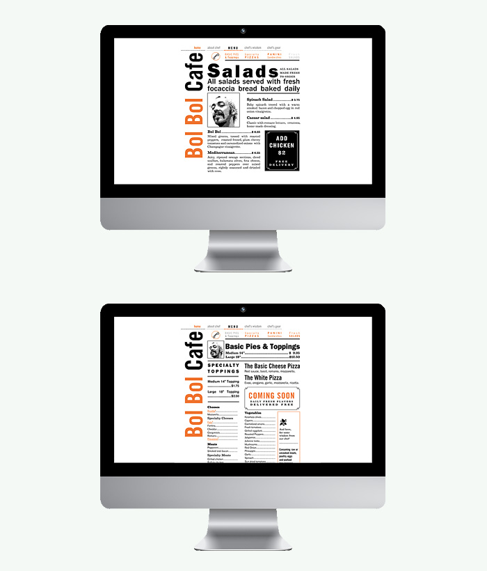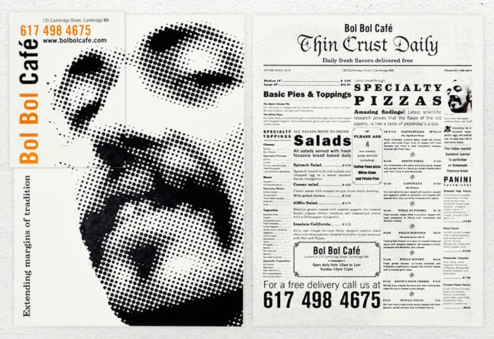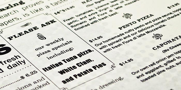 Thought was applied to the take-out/sit-in menu, by crafting it to resemble an old newsletter,